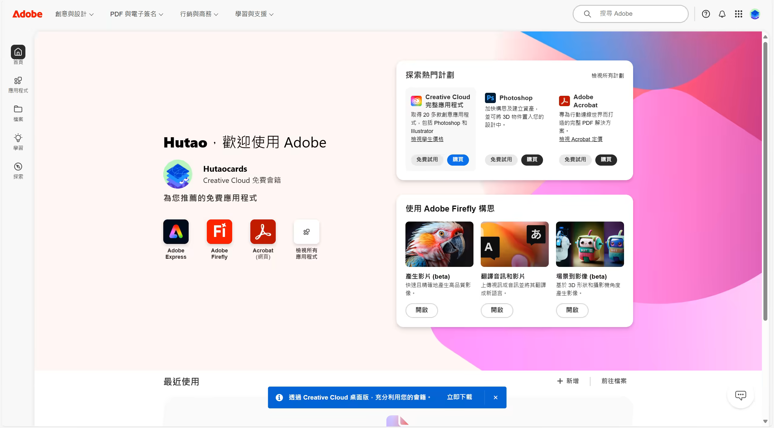 在完成注册和登录后,点击左侧侧边栏的应用程序按钮。然后点击检查所有 Creative Cloud 计划与定价