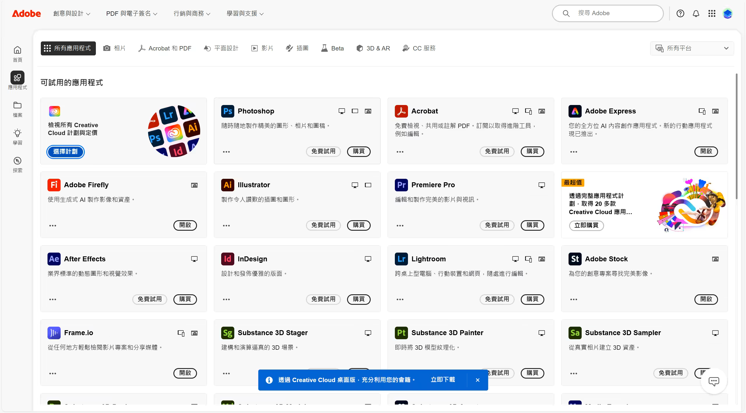 完成后您就可以在 https://www.adobe.com/apps/all/desktop 中下载 Creative Cloud 登录账号开始使用了!