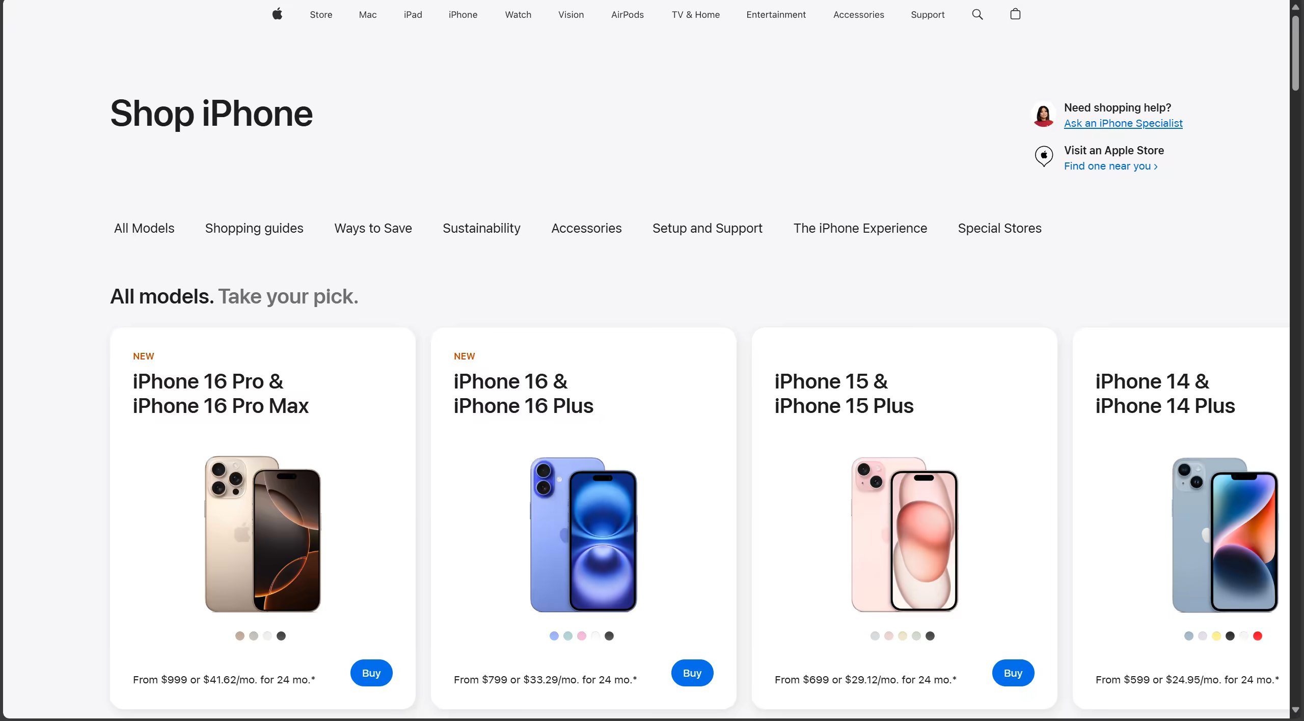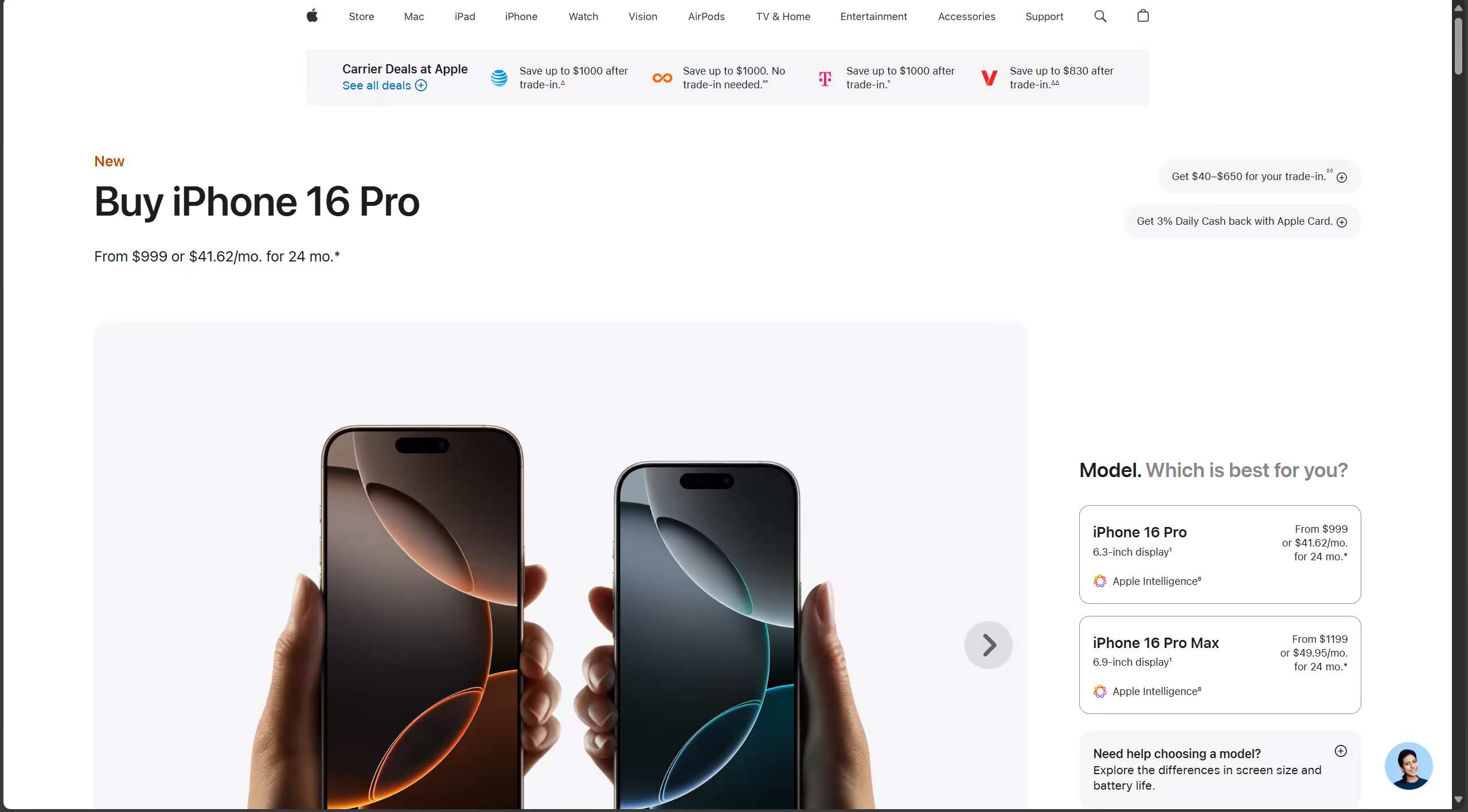 我们选择 iPhone 16 Pro Max。选择你想要的颜色和存储容量。之后选择你是否需要 trade-in。在选择 Payment options 选择 Buy 因为 Hutaocards 并不支持分期付款。在 Connectivity 中选择 Connect to any carrier later。AppleCare+ coverage 按照需求购买即可。