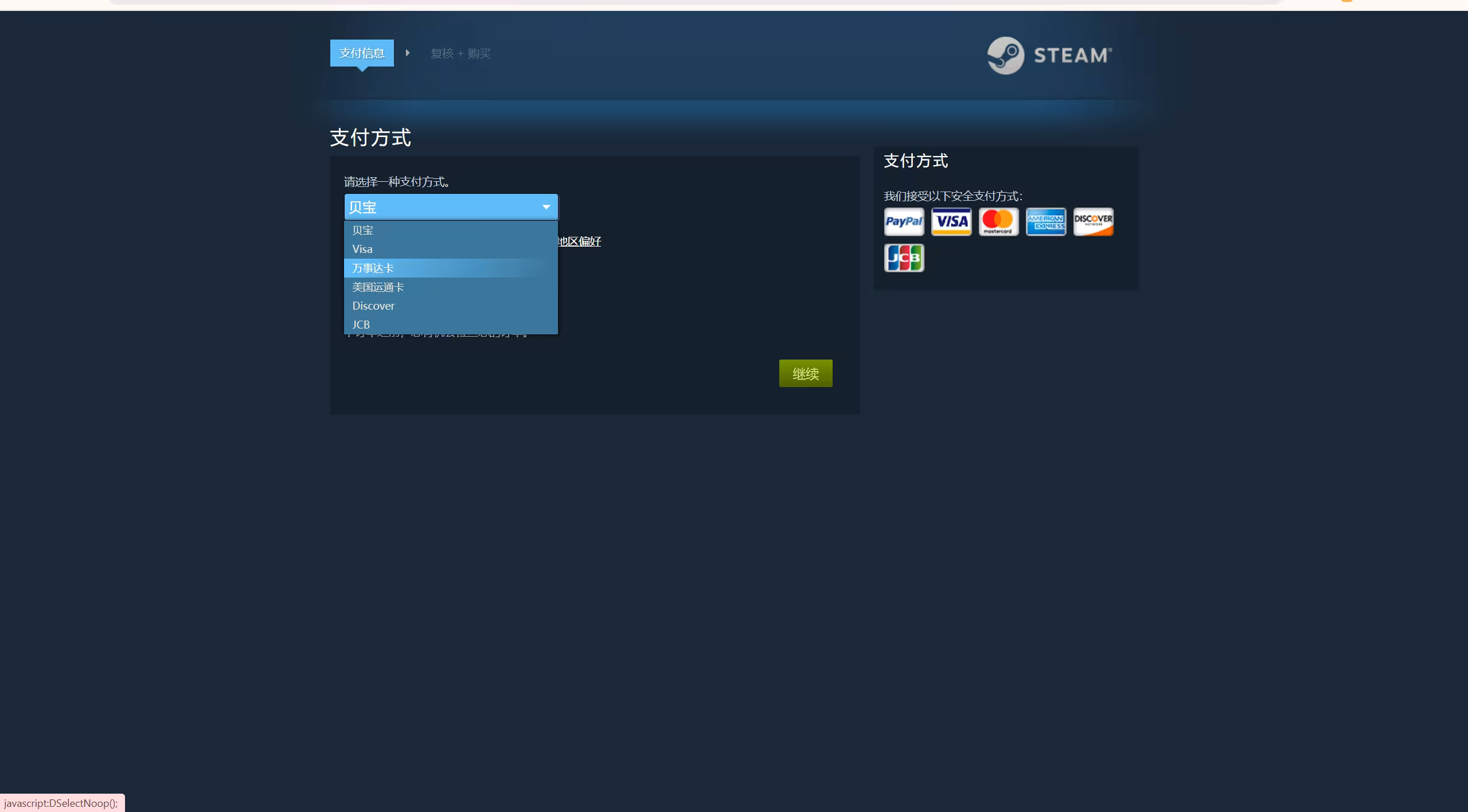选择支付方式。点击万事达卡输入您的 Hutaocards 卡片。点击继续。