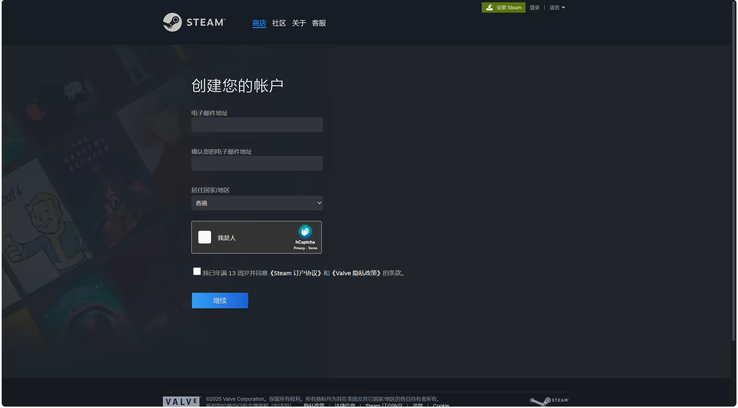 勾选我是人和我已年满 13 周岁并同意《Steam 订户协议》和《Valve 隐私政策》的条款。