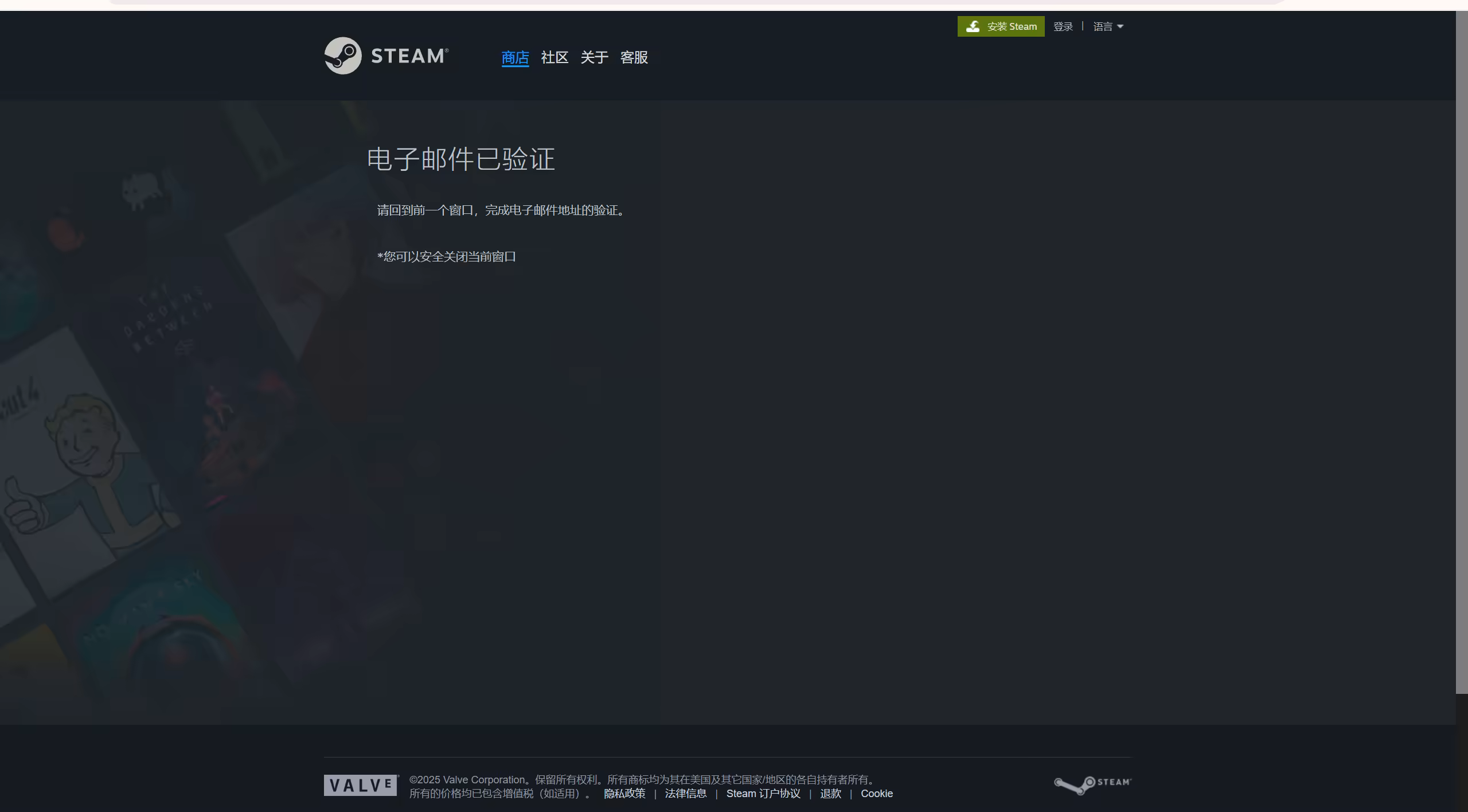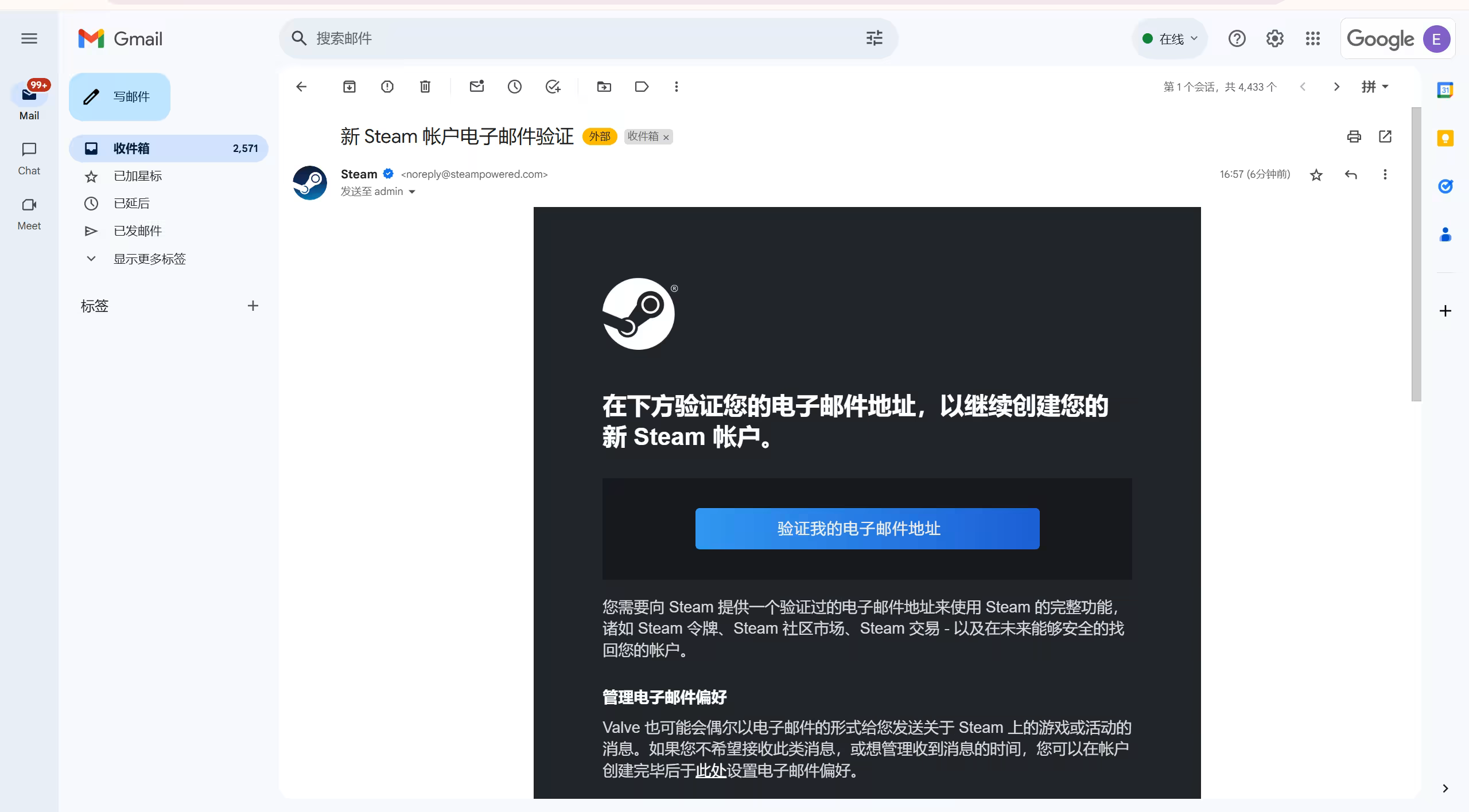 新 Steam 账户电子邮件验证的 Email。点开它,点击验证我的电子邮件地址。